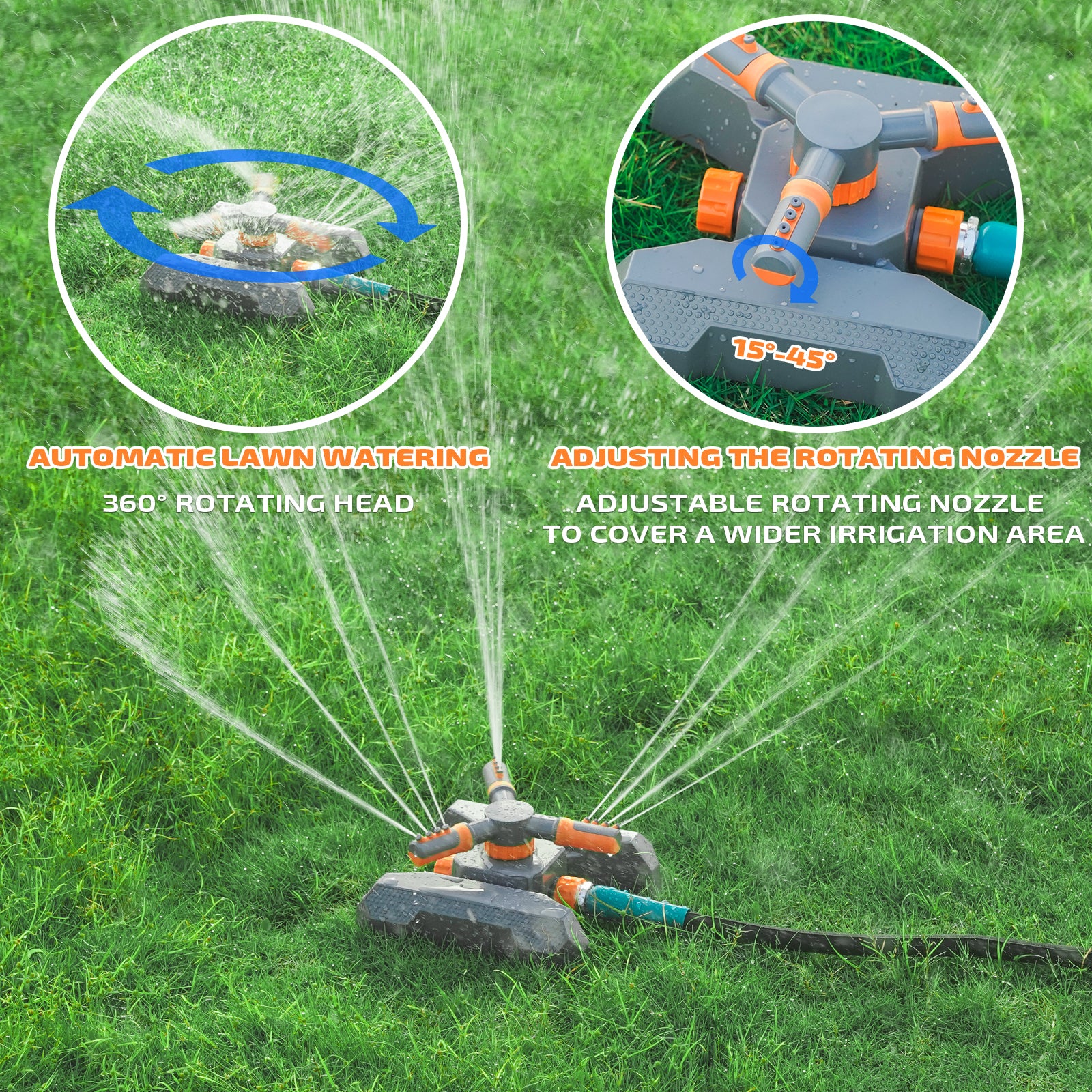 - Adjustable Irrigation: Equipped with 360-degree rotational capability and adjustable spray angles, our water sprinkler for the lawn ensures every inch of your land receives optimal hydration. Easily customize spray patterns to suit specific needs, ensuring uniform coverage across every corner with this versatile garden sprinkler